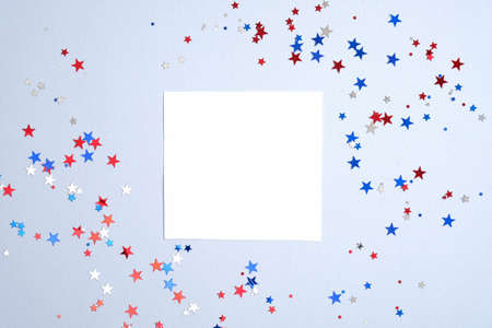 Independence day USA banner mockup with confetti stars in American national colors and blank paper card. USA Presidents Day, American Labor day, Memorial Day, US election concept.