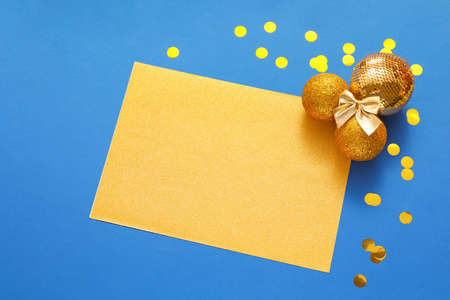 Beautiful festive blue background with sparkles and Christmas golden toys. Holiday Content