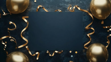 Navy blue and gold balloon frame with ribbon streamers, metallic elements and blank paper. generative ai