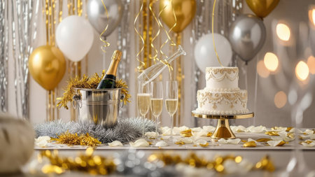 Celebratory scene with confetti, balloons, and champagne glasses on festive table