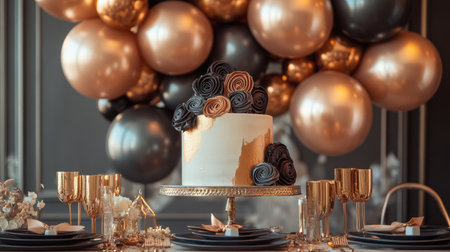 A luxurious birthday table with a designer cake, metallic balloons, and elegant tableware.