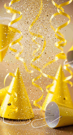 A vibrant and festive background featuring shiny decorations, colorful party hats, and sparkling confetti. Perfect for celebrations and joyful events.