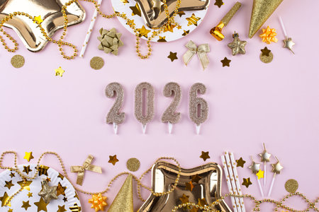 A festive arrangement for the New Year 2026, featuring shiny balloons spelling out the year, surrounded by glittering ornaments and warm, twinkling lights.