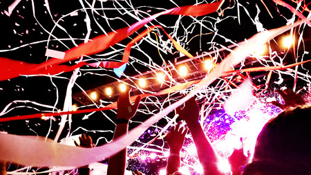 cheering crowd with raised hands and falling confetti at concert - music festival