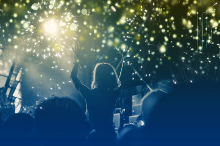 New Year concept - cheering crowd and fireworks, Group of people having fun at music concert.