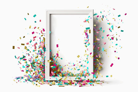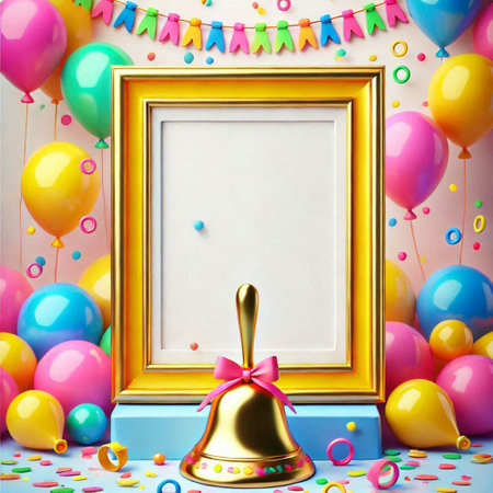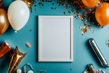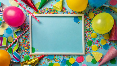 Colorful party decorations surround an empty frame on a vibrant backdrop. Balloons, streamers, and confetti create a joyful atmosphere, perfect for invitations or announcements.