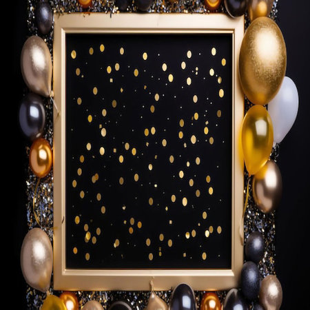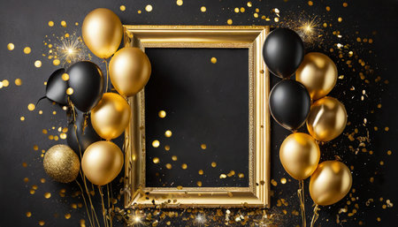 Golden and black balloons with golden frame and confetti on black background. Flat lay, top view