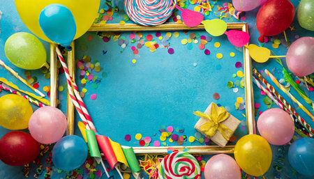multicolored carnival or birthday background on blue with a frame of colorful party balloons streamers confetti and candy