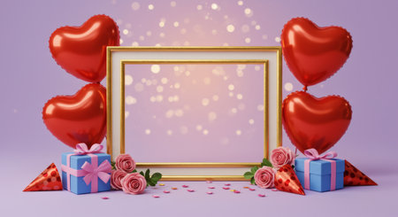 A golden frame sits amidst heart balloons, gifts, and roses, perfect for Valentine's Day greetings or celebratory announcements.
