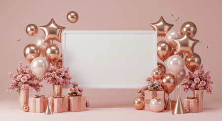 Celebratory pink and copper balloons, floral arrangements, and gifts frame a blank white space for personalized messages or promotions Perfectly for birthday and celebration designs.