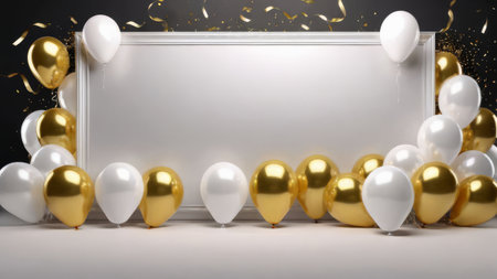 Clusters of white and gold balloons flank a blank, illuminated rectangular frame against a light neutral background.