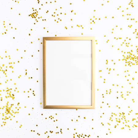 Photo frame mock up with space for text, golden confetti on white background. Lay Flat, top view. Valentines minimal background.