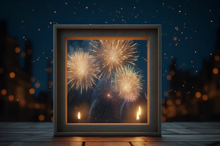 Illuminate your designs with the charm of Silvester using a rustic wooden background adorned with a frame of sparkling sparklers and bokeh lights, creating a festive atmosphere for your New Year's Eve event