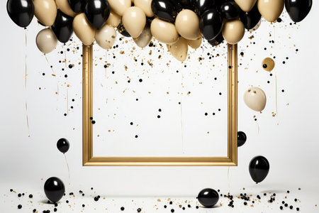 Holiday Christmas white frame or mockup background with golden and black balloons. Copy space for text. Christmas, New year, birthday, party celebration concept.