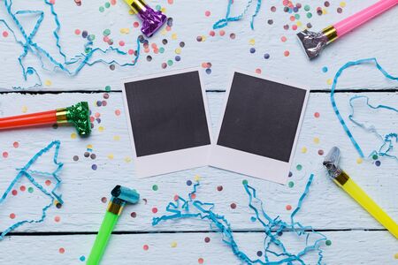 Party Holiday Background with ribbon, stars, birthday candles, gift box empty frame and confetti on blue background. Studio Photo