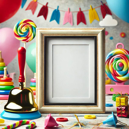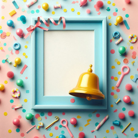 Bright and cheerful celebration setting with empty frame and decorated treats on a light blue background