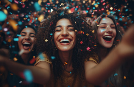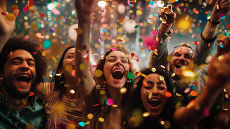 A group of cheerful friends are joyfully celebrating together, surrounded by colorful confetti and excitement