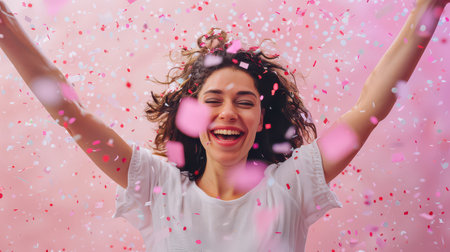 A vibrant image of a joyful woman celebrating joyfully while surrounded by shimmering gold and silver confetti, embodying the spirit of happiness and celebration. Perfect for event themes.