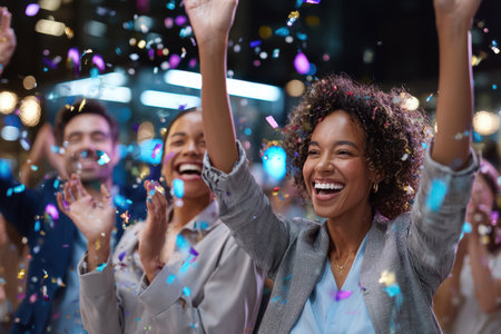 Happy diverse employees team celebrating success business achievement among confetti. AI Generated.
