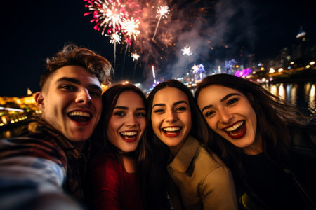 A Group of Friends Immortalizing their New Year's Celebration with a Selfie Against a Firework-Filled Sky