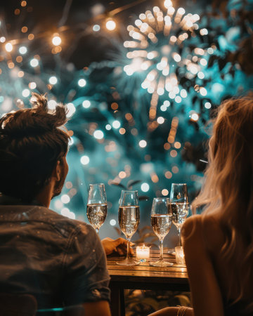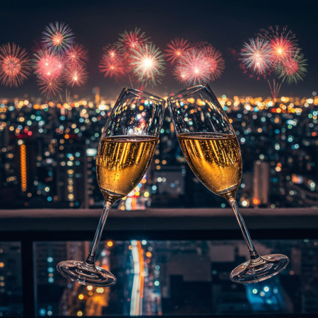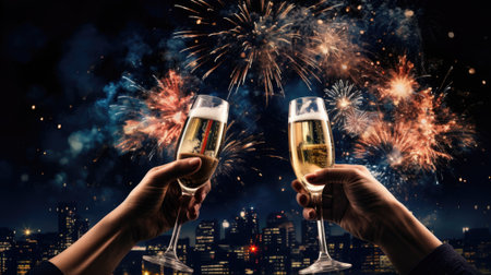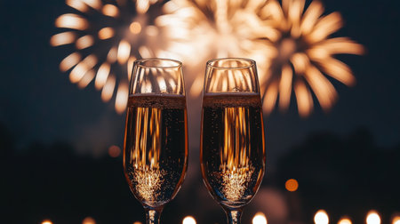 New Years celebration with fireworks and champagne glasses at night comeliness