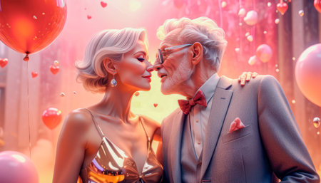 Happy senior couple celebrating anniversary or Valentine's Day against the background of balloons. Portrait of happy aged woman and man.