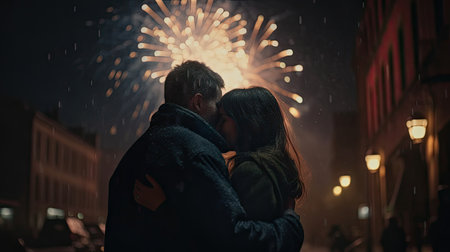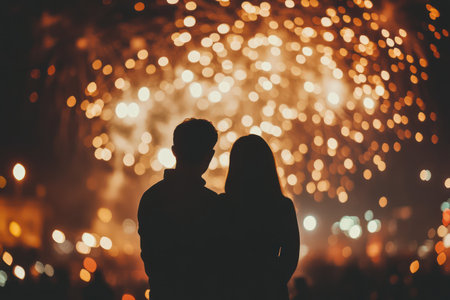 A couple stands in silhouette under a night sky filled with fireworks, capturing romance, celebration, and shared joyful moments.
