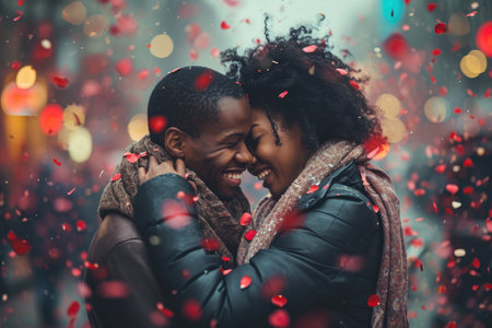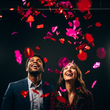 A man and woman are throwing confetti in the air, both smiling and laughing. Concept of joy and celebration, as the couple is likely celebrating a special occasion or milestone
