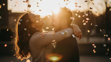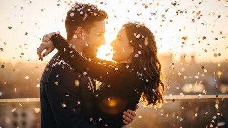 A romantic couple dances closely together amidst a shower of confetti during a beautiful sunset. The warm, golden light of the setting sun casts a soft glow on their faces, creating a magical and intimate atmosphere. The confetti adds a festive touch to the scene, enhancing the joyful and celebratory mood. The cityscape in the background suggests an urban setting, possibly on a rooftop or high vantage point.