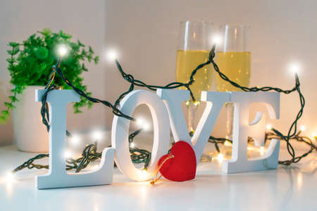 Two glasses with a cocktail and two hearts with the inscription Love. Valentine's day concept. On a dark background with bokeh. glare