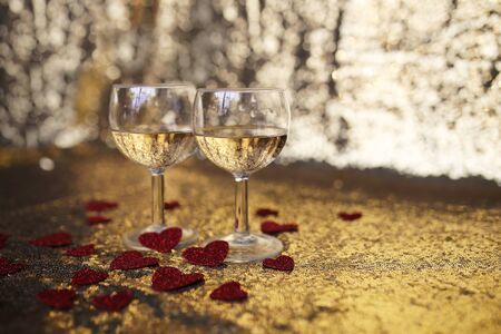 Two Sparkling White Wine in Glasses with Heart Confetti and Gold Sequin Background