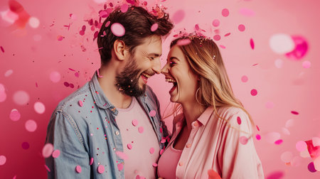 A Couple Embraces the Magic of Gender Reveal Amidst Colored pink confetti on a plain backdrop. A Man and a woman are laughing