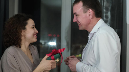 Happy Valentines Day. A man gives his beloved woman a gift. Husband gives his wife pleasant surprises