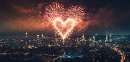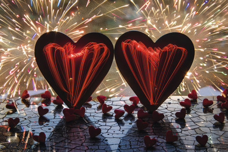A mesmerizing display of romantic hearts illuminated by a stunning fireworks event