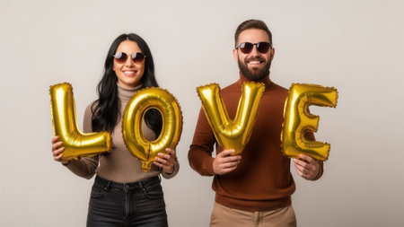 A happy couple wearing sunglasses holds up gold letter balloons spelling out LOVE, symbolizing romance and celebration.