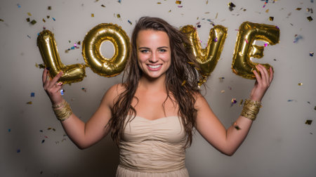 A smiling young woman with long brown hair holds up gold balloons spelling out LOVE at a party with confetti.