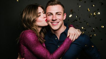A couple shares an intimate moment with a kiss as golden confetti falls. The image captures the essence of celebration, happiness, and romantic connection.