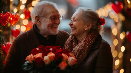 Elderly couple celebrating valentine's day, exchanging loving glances, holding red roses, with heart-shaped lights in the background