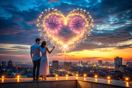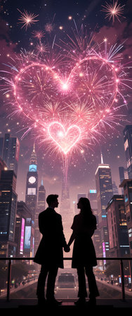 A romantic silhouette couple holding hand in love watching pink heart firework display at night over city skyline. magical celebration