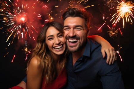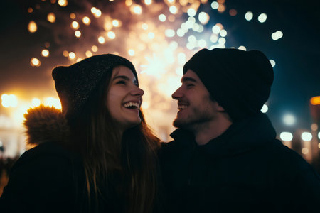 Happy couple laughing joyfully while watching a stunning fireworks display lighting up the night sky during a festive celebration