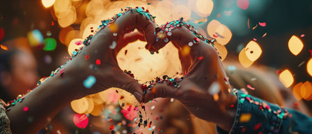 A Playful Shot Of A Couples Hands Making A Heart Shape With Colorful Confetti.
