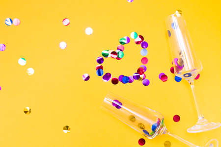 two glass champagne glasses not with a yellow background strewn with confetti, shiny circles, Valentine's day concept, wedding day, lovers' date, place of copy, heart from confetti