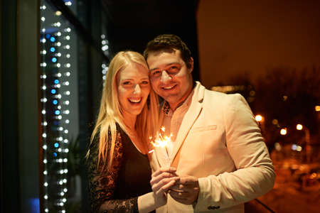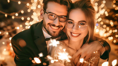 A young couple, dressed in formal wear, pose with sparklers in front of a festive background. They smile and laugh at the camera, enjoying their New Year's Eve celebration.