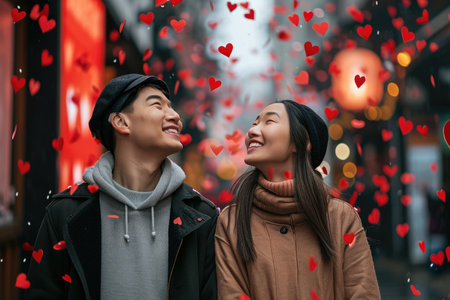A playful moment between a couple throwing heart-shaped confetti in the air and laughing.