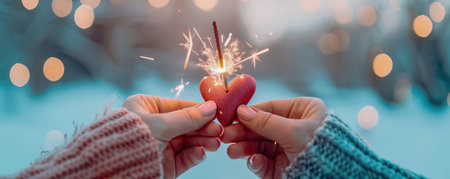 A couple radiates love and joy as they hold a sparkling heart, creating a magical Valentine's Day moment Their embrace is warm and tender, lit by the enchanting glow of the sparkler, a symbol of their unwavering bond The festive atmosphere and heartwarming scenery make this a picture of perfect love and happiness AI Generative