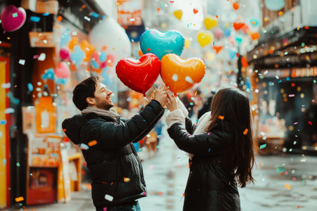 A cheerful couple exchanging heart-shaped balloons in a bustling city square, surrounded by colorful shops and festive confetti, creating a joyful Valentine Day celebration