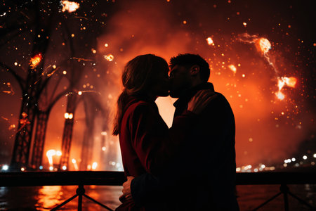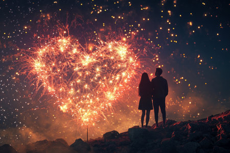 A couple's love ignites under a starry sky, mirrored by vibrant fireworks This breathtaking image captures their deep connection during a festival, sparking joy and wonder It's a moment of shared magic, perfect for romantic projects, evoking feelings of passion and shared celebration AI Generative