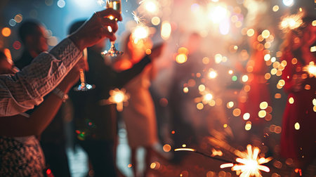 A vibrant sparkler releases bright sparks, illuminating the night with a warm glow while a festive atmosphere surrounds the celebration. The background is alive with shimmering bokeh lights.