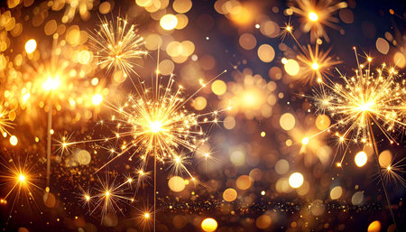 Glowing sparklers burst against a dark, bokeh-filled background; golden light flares and sparkles create a celebratory, festive mood