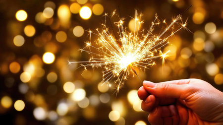 A close-up photo of a hand holding a burning sparkler that is emitting golden sparks in the dark of night. The blurred bokeh lights in the background create a festive party atmosphere. This image represents celebration, joy, hope, magic, and special moments. Perfect for any celebration such as New Year's Eve, holidays, birthdays, and weddings.